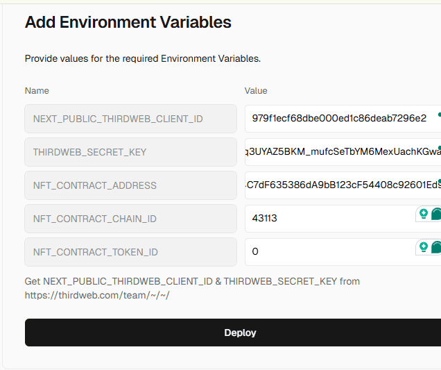 NEXT_PUBLIC_THIRDWEB_CLIENT_ID: Your thirdweb Client IDTHIRDWEB_SECRET_KEY: Your thirdweb Secret KeyNFT_CONTRACT_ADDRESS: Your NFT contract addressNFT_CONTRACT_CHAIN_ID: Chain ID (e.g., 43113 for Avalanche testnet)NFT_CONTRACT_TOKEN_ID:0for ERC-721 or the token ID for ERC-1155