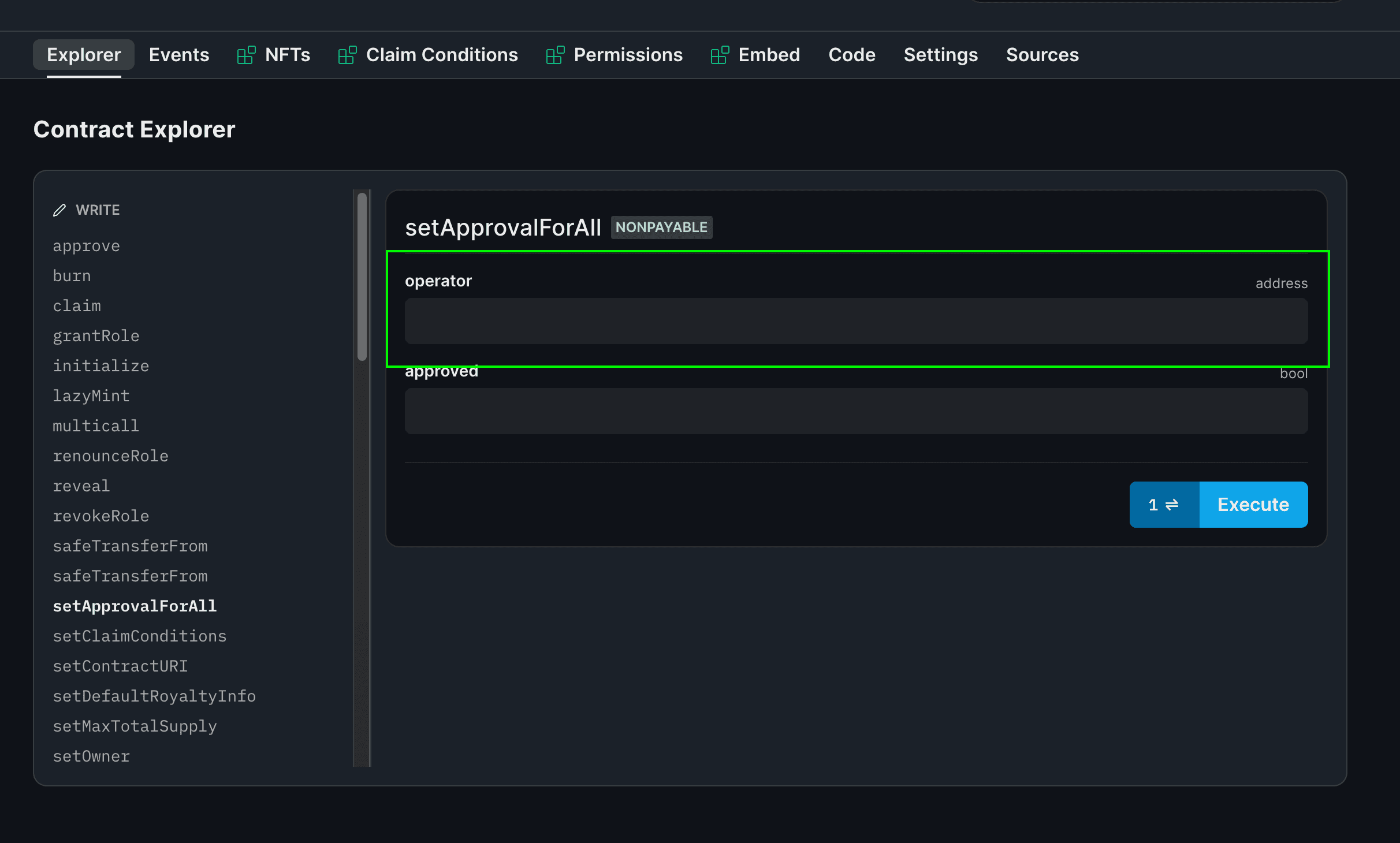 approveorsetApprovalForAll. We recommendsetApprovalForAllfor large airdrops so you don’t need to approve each token ID individually. - Enter your NFT/token parameters into the airdrop contract’s