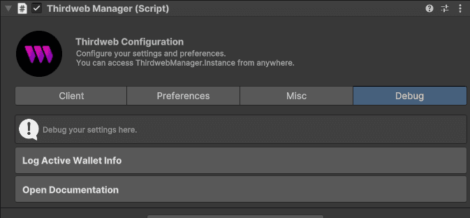 Configure ThirdwebManager through the Unity Inspector window.